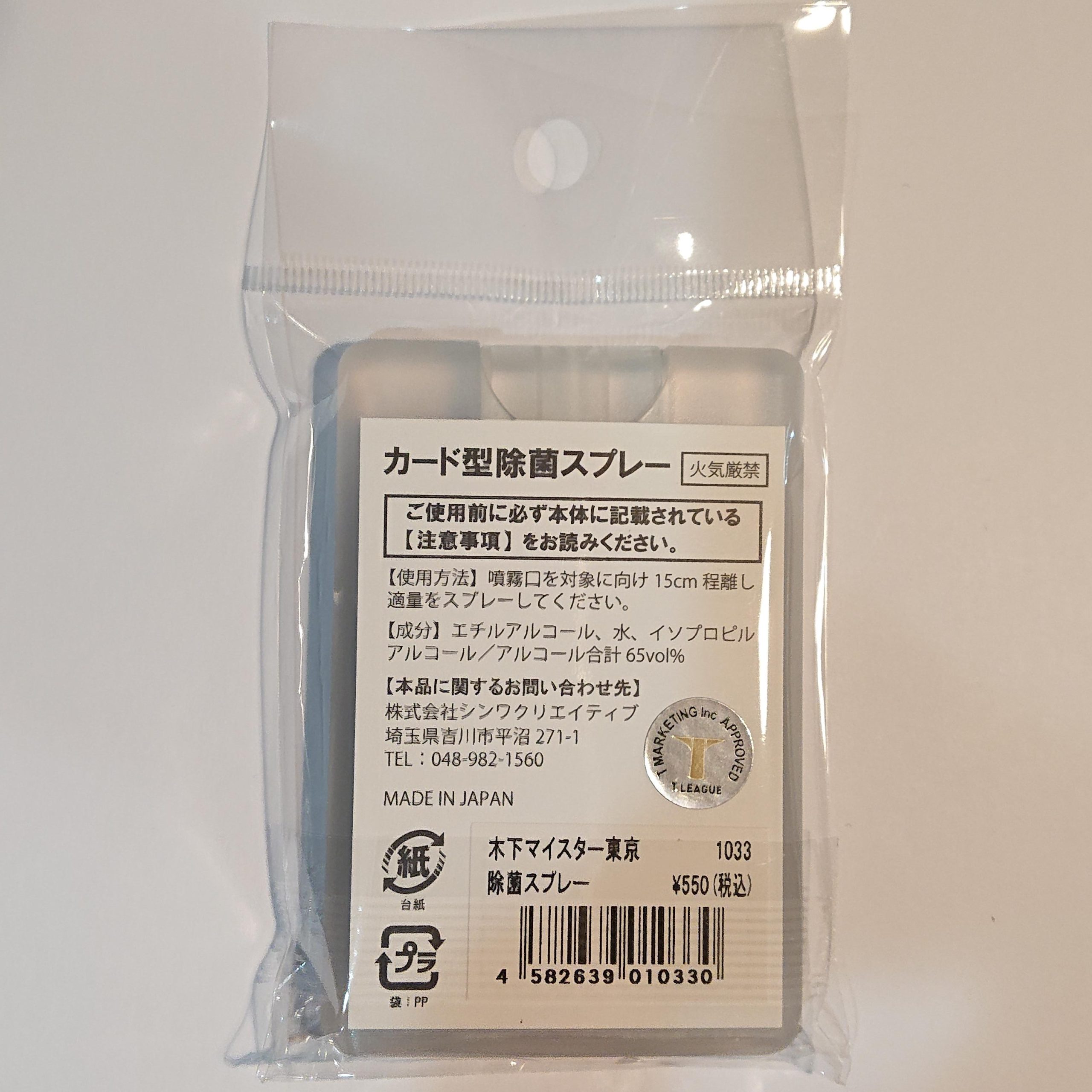 カード型除菌スプレー 【木下マイスター東京】 カード型除菌スプレー 【木下マイスター東京】 (1033) 厚さ11㎜の薄型で、胸ポケットでもかさばらずに携帯できます。 手指等にスプレーし、感染予防対策。 これまでTリーグ試合会場でのみ販売されていた商品を、本サイトで購入できるようになりました。 成分 エチルアルコール、水、イソプロビルアルコール /アルコール合計65vol% 容器素材:PP 内容量:16ml 商品サイズ:約84×57×11㎜ パッケージ:PP袋 日本製 在庫状態 : 在庫有り ¥550(税込) 数量