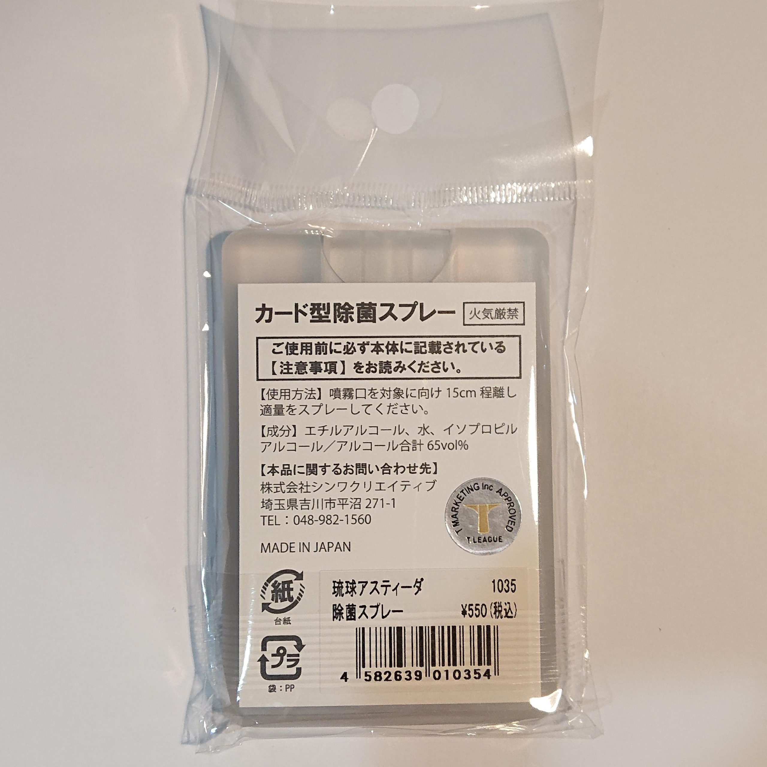 カード型除菌スプレー 【琉球アスティーダ】 カード型除菌スプレー 【琉球アスティーダ】 (1035) 厚さ11㎜の薄型で、胸ポケットでもかさばらずに携帯できます。 手指等にスプレーし、感染予防対策。 これまでTリーグ試合会場でのみ販売されていた商品を、本サイトで購入できるようになりました。 成分 エチルアルコール、水、イソプロビルアルコール /アルコール合計65vol% 容器素材:PP 内容量:16ml 商品サイズ:約84×57×11㎜ パッケージ:PP袋 日本製 業務パック割引 5~9で1あたり¥523(税込) 10~19で1あたり¥495(税込) 20以上で1あたり¥468(税込) 在庫状態 : 在庫有り ¥550(税込) 数量